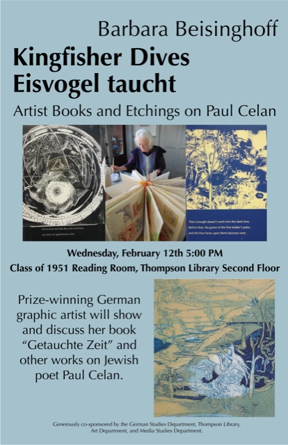On Wednesday February 12, 5 PM, Barbara is going to show and discuss her artist books and etchings on Paul Celan and other new works in the Class of 1951 Reading Room, which is on the second floor of our beautiful library.