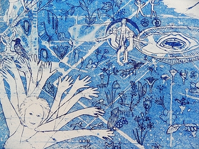 Ich habe derweil in Womens‘ Studio Workshop, NY, Bilder zu meinem neuen Künstlerbuch ‚Blues‘ in eine 35er Auflage in Siebdruck umgesetzt. Die ultramarinblauen Drucke folgen dem poetischen Text von Helma Sanders-Brahms 2013 über unser blühendes Flachsfeld in Rhoden. Die Regisseurin des Films ‚Deutschland, bleiche Mutter‘ hatte uns im Sommer 2012 besucht. Sie beschreibt die Flachspflanzen als Wesen, die sich vereint dem Himmelsblau entgegenrecken. ‚Aber ihre Kraft reicht nicht bis in die dunkle Zeit.‘ Sie hatte sich von Nachbarinnen in Rhoden Leinenvorräte zeigen lassen ‚feste Stoffe, auf denen die Träume der Menschen in der Nacht gut aufgehoben sein sollten und beschützt vor den Mächten der Unterwelt‘. Aber wie zeichnet man Träume?